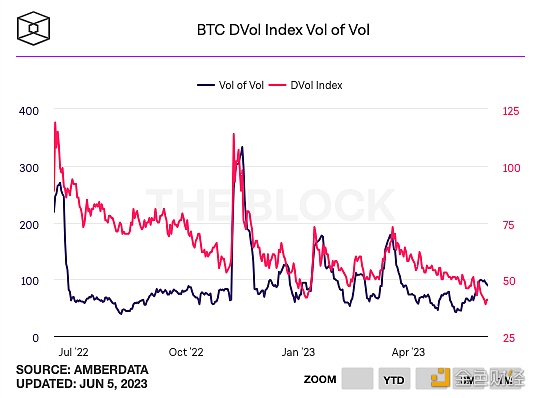 尽管美国证券交易委员会(SEC)对Binance提起了诉讼,加密货币市场的波动性依然保持在低位。根据The Block的数据仪表板,BTC DVol指数从6月3日的39(今年的最低点)小幅上升到了6月5日的41。LedgerPrime的Laura Vidiella提到,目前的波动率是自2020年以来最低的水平。她进一步解释说,夏季通常是市场平静且波动性较低的时期,交易员们对此已经做好了准备。SEC宣布诉讼后市场波动性不大的一个可能原因是,大型交易商已经预期到对Binance可能采取某种形式的监管行动。然而,与FTX的崩溃不同,目前没有迹象显示客户资金受到影响,同时也不清楚SEC的权力是否会进一步扩展到Binance的运营中。