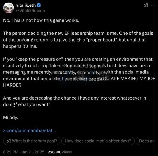 这位交易员的言论显然激怒了 Vitalik。他直接回怼道:“游戏不是这么玩的!谁来领导以太坊基金会,我说了算。改革的目标是给基金会找一个合适的董事会,但在那之前,决定权在我手里。你们搞这些‘持续施压’,只会让顶尖人才望而却步。”