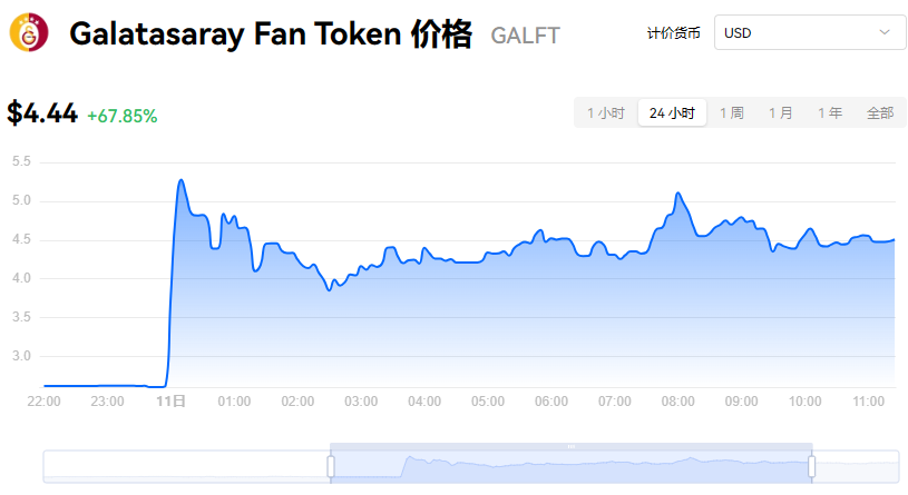 Galatasaray Fan Token当前价格为$4.44。在过去24小时内,价格上涨了67.85%。目前,Galatasaray Fan Token在市值排名中位列第248名,实时市值为$2,875.94万,流通供应量为639.24万GALFT,最大供应量为997.50万GALFT。我们会实时更新Galatasaray Fan Token/USD的价格数据。