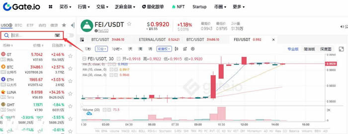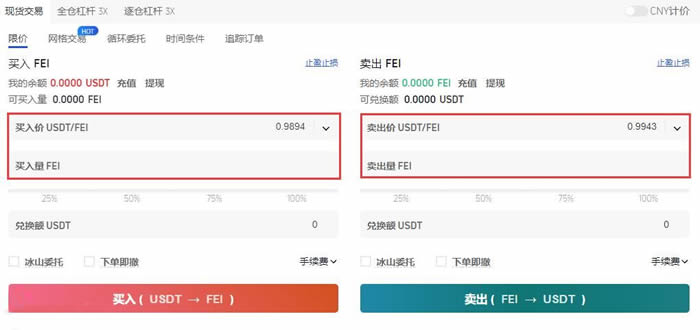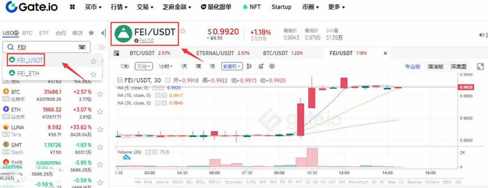 第三步:选择FEI/USDT交易对,进入购买页面。