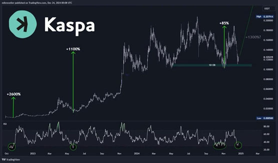 另一方面,社群用户 @mikroweller 发推表示,KAS 的日线 RSI 指标已经达到超卖区域,而这种情况在历史上只出现过三次,并且每次达到超卖区域都意味着价格已经触底,随后平均反弹幅度达到 1300%。