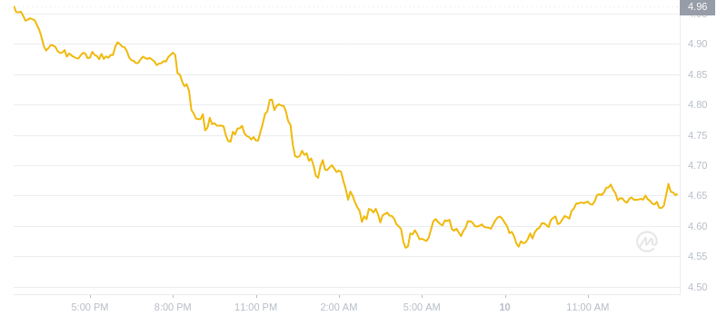 截至今天下午2点,NEAR Protocol (NEAR) 的价格为4.6477美元,24小时内的交易量达到了2.251亿美元。从图表上看,NEAR的价格在过去24小时内下跌了6.39%,目前正处于一个回调阶段。