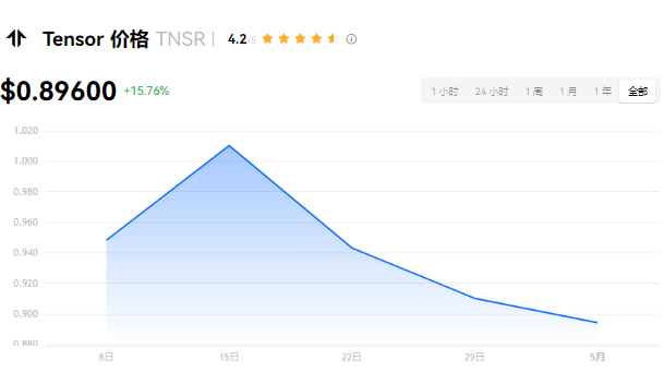 Tensor 当前价格为 $0.89600。Tensor 的价格在过去 24 小时内上涨了 +15.76%。目前,Tensor 市值排名为第 190 名,实时市值为 $1.12亿,流通供应量为 125,000,000 TNSR,最大供应量为 1,000,000,000 TNSR。我们会实时更新 Tensor/USD 的价格。