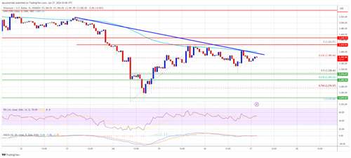 以太坊价格目前低于3400美元和100小时简单移动平均线。在每小时图表上,ETH/USD在3400美元附近形成了一条看跌趋势线,这给价格上涨带来了阻力。要继续上涨,以太坊需要突破3400美元和3425美元的阻力位。