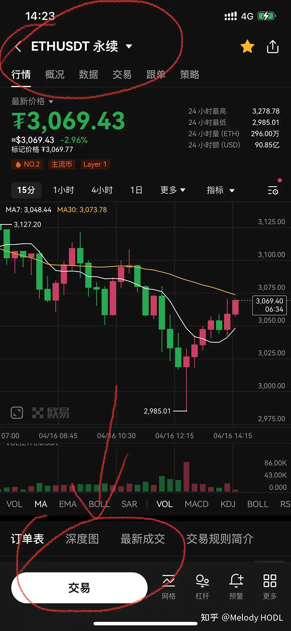 第二步进入交易对的详情页面,关注最上面的ETHUSDT永续交易对。这个界面的目的是查看各项数据指标,每个数据指标都有参考意义,需要自行学习,特别重要。确认后,直接点击下方的交易,进入交易界面。