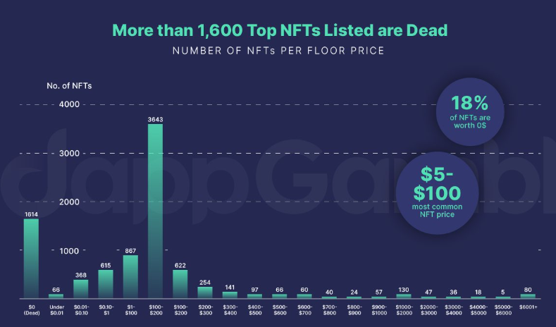 DappGambl的研究报告名为《死亡NFT:NFT市场不断演变的格局》,分析了73,257个NFT藏品。研究发现,其中69,795个藏品的以太坊市值为零。虽然NFT曾因售价数百万美元而成为头条新闻,但研究还表明,只有不到1%的NFT价格超过6,000美元。这表明高价值的NFT非常稀有。