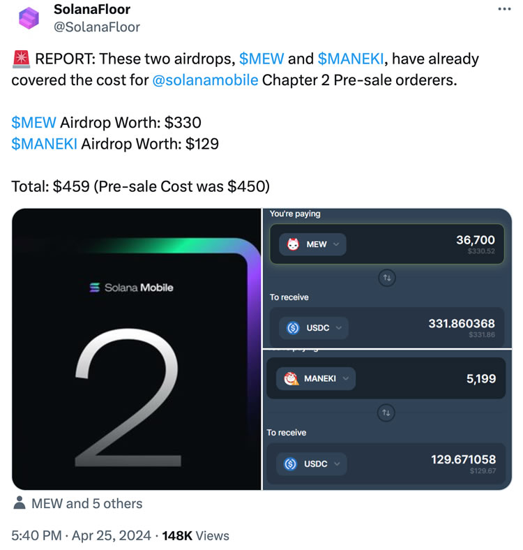 MANEKI还向Solana用户空投了价值超过2000万美元的MANEKI代币,这些用户预购了尚未上线的Solana "Chapter 2" Mobile。据称,每位用户获得了价值129美元的空投,加上价值330美元的MEW空投,据说可以抵消设备的成本。