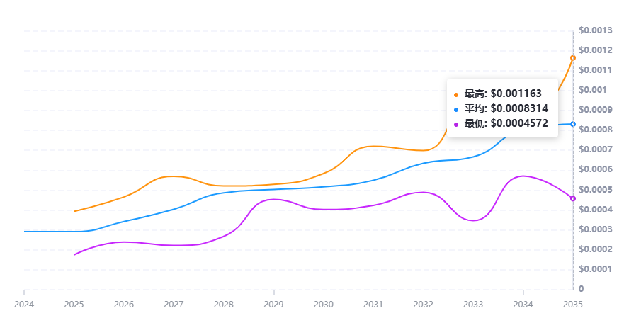 2027 年,预计大部分的 Clayton 将在 $0.0004037 徘徊,预计最低价为 $0.000222,最高价为 $0.0005692。根据这一预测,如果您以当前的市场价格 $0.0002912 购买,您的潜在收益率是 +35.00%。