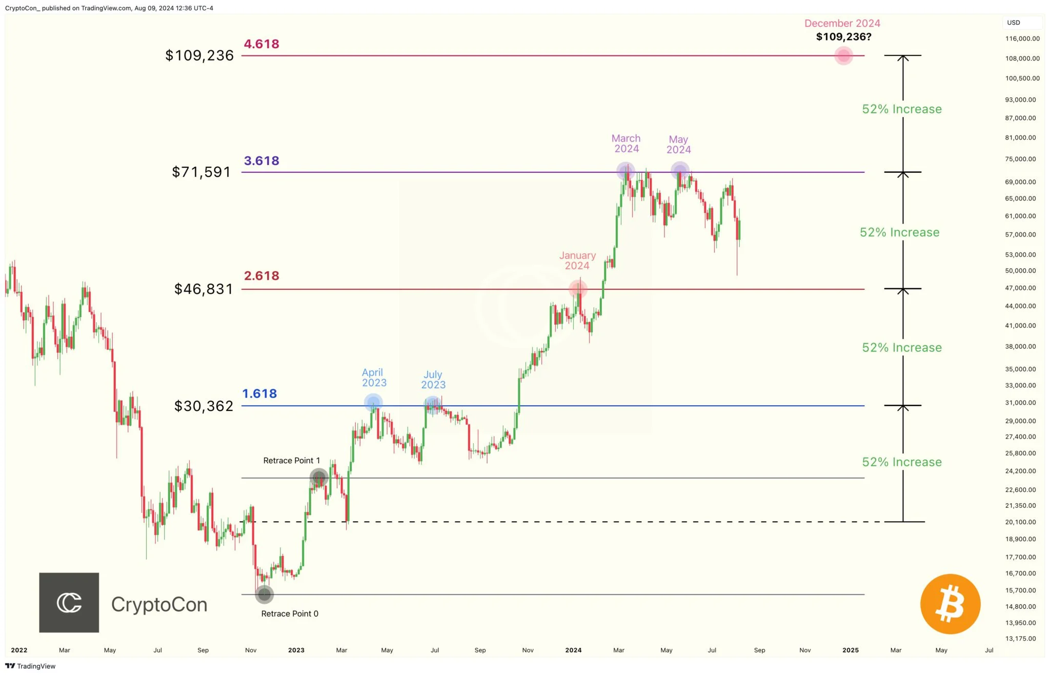 技术分析师@CryptoCon_在今日凌晨发文指出,比特币的「斐波那契延伸」准确预测了本轮周期中的每个局部高点。他表示,接下来的52%涨幅和0.618延伸将推动比特币价格突破100,000美元大关,达到109,236美元。如果「落后1个月的2023年」趋势持续,年底前突破10万美元并非不可能。