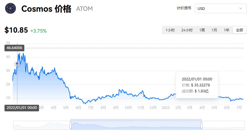 Cosmos 当前价格约为 $10.85,在过去 24 小时内上涨了 3.75%。目前,Cosmos 市值排名为第 25 位,实时市值约为 $41.39 亿,流通供应量约为 3.83 亿 ATOM,最大供应量为 3.83 亿 ATOM。