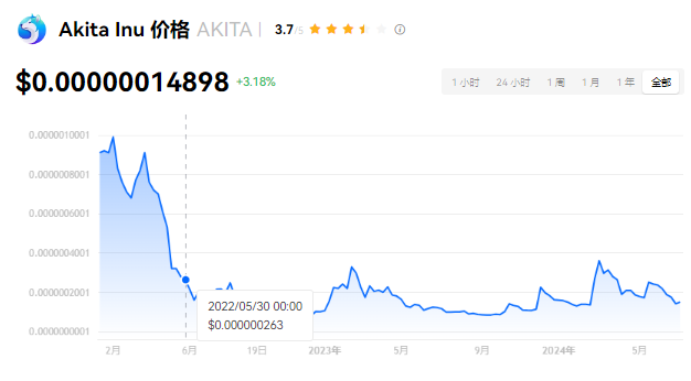 在过去24小时内,AKITA币的价格最低达到了$0.00000013887,最高则为$0.00000015488。目前,AKITA币在热度排行中位列148,市值排行第250位。它的市值为$1,492.00万,约有3.24%的用户将其添加到自选中。AKITA币的历史最高价为$0.000015000,出现在2021年5月14日,相比当前价格下跌了99.01%。历史最低价为$0.000000074000,出现在2022年12月17日,相比当前价格上涨了101.31%。AKITA币首次发行于2021年2月3日,发行价为$0,流通总量为100,000,000,000,000 AKITA。
