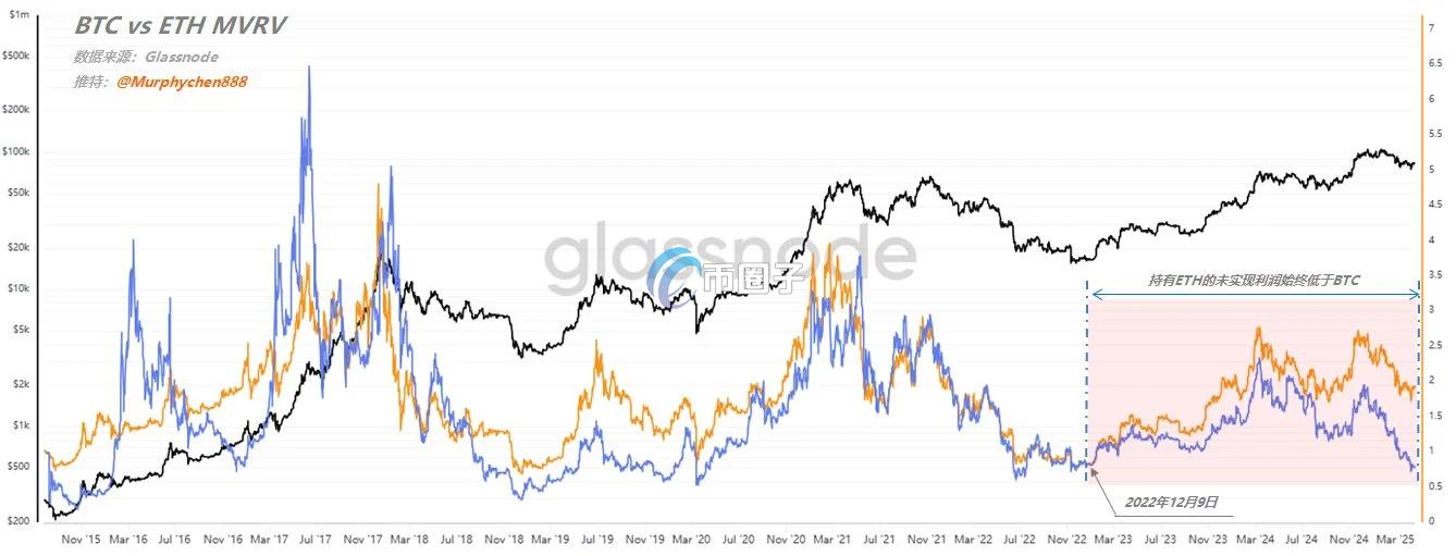Murphy 还发现,从 2022 年 12 月开始,比特币的 MVRV(市场价值与实际价值比率)和以太坊的 MVRV 出现了明显的分化。在此之前,这两个指标一直都是交替领先,也就是说,有时候以太坊更强,有时候比特币更强。但现在,比特币的 MVRV 始终高于以太坊,这意味着从 2022 年 12 月以后,以太坊持有者的未实现利润始终低于比特币。
