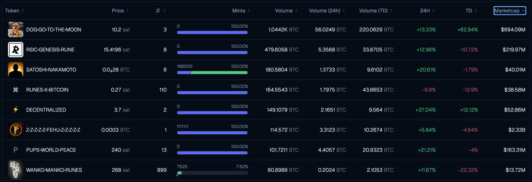 市场最关注的当属稳坐符文市值第一宝座的DOG•GO•TO•THE•MOON($DOG)。这枚代币曾在Runestone空投中飙破0.09BTC,今日稍早再度创下新高,一度触及0.007542美元。截至目前,价格报0.007134美元,近24小时涨幅近18%,近两周已翻涨逾2倍。市值也随之突破7亿美元,成为市值第132大加密货币。