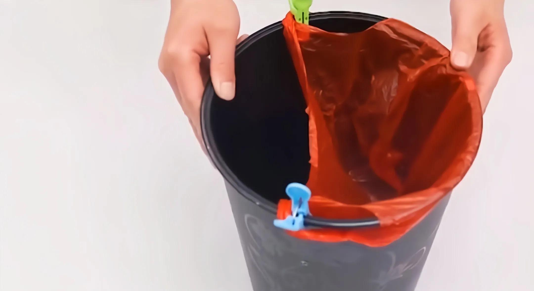 3、家里的小号垃圾袋不要轻易扔掉。只要借助家里常用的夹子,将它直接夹在垃圾桶上面,再将垃圾袋套在夹子上,根据垃圾袋的大小调节夹子,小号垃圾袋也能牢固地套在垃圾桶上。这样一个垃圾桶就能轻松分类两个垃圾袋了。