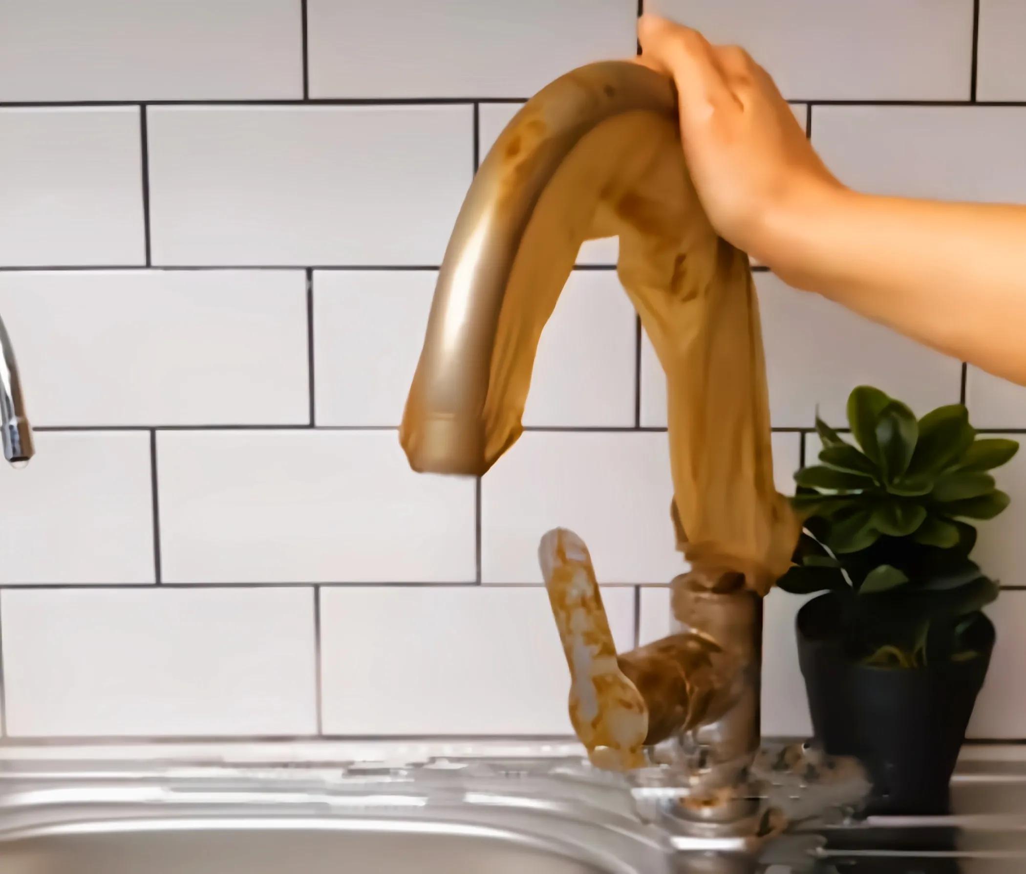 7、妈妈新买的长筒丝袜,用白醋泡一泡,然后直接套在水龙头上软化几分钟,再轻轻推下来,你会发现水龙头变得超级干净!
