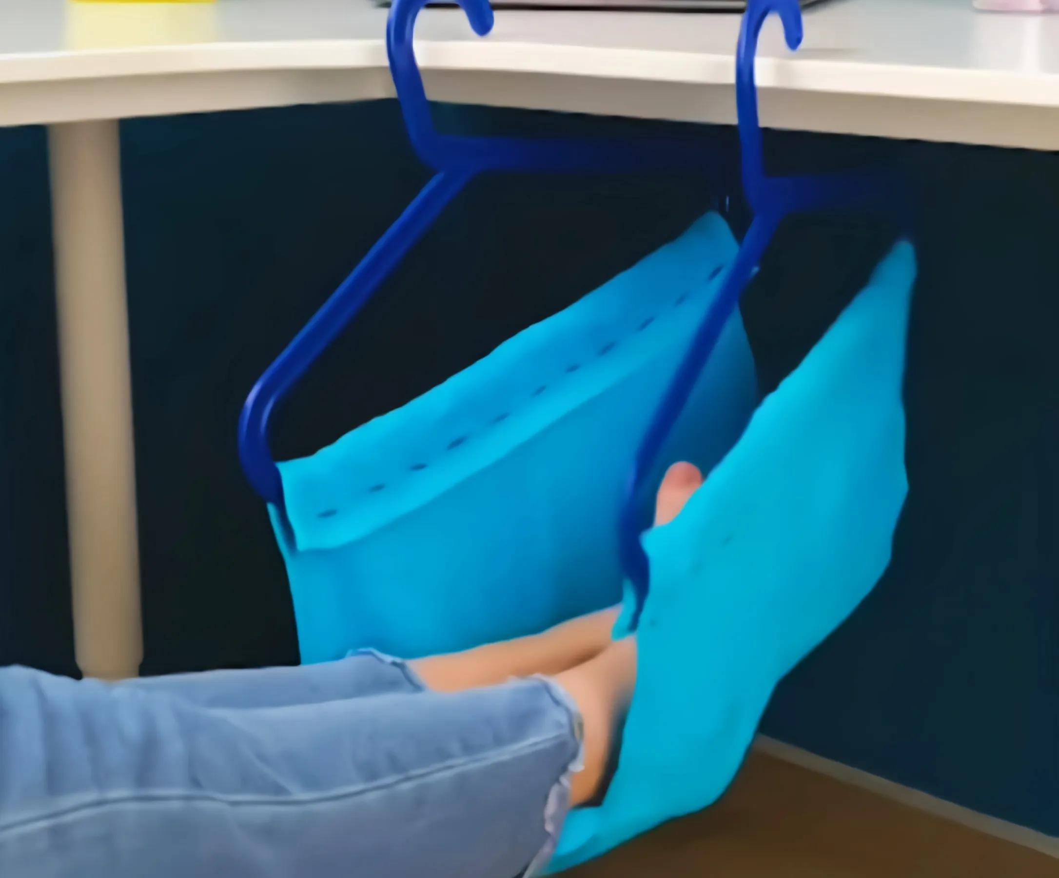 9、毛巾别只用来洗脸了,把它和晾衣架一起用,效果超棒。用针线将毛巾固定在衣架上,重复两次,然后挂在办公桌下面,用来放脚,简直不要太爽了!