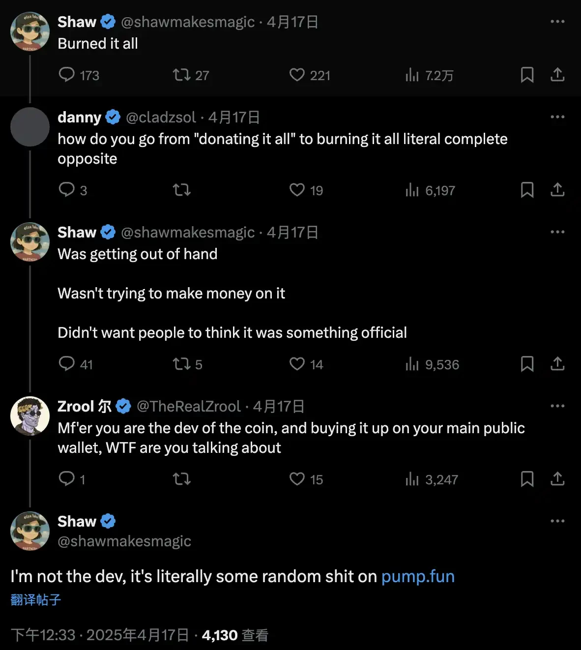 面对网友的质疑,Shaw 否认自己是项目方,并解释说:“我在 Pumpfun 上买了几种随机币,它们就开始涨了。我说我会捐赠它们,但后来有人告诉我这是一个 SCAM,所以我把代币烧掉了,抱歉造成混淆。我只是想玩玩而已。”