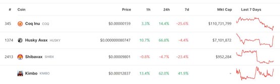 受此消息影响,Avalanche 上的 Meme 币多数呈现暴涨。以母鸡为主题的 CoqInu (COQ) Meme 币过去 24 小时涨幅超过 14%;而以狗图案为主题的 Meme 币如 kimbo (KIMBO) 和 Husky Avax (HUSKY) 更是有超过 60% 的涨幅。