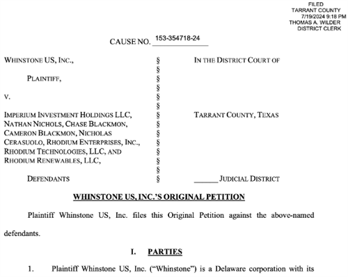Whinstone US在德克萨斯州塔兰特县第153区法院对三家公司及其高管提起了诉讼,指控他们存在欺诈、阴谋和违反证券规定的行为,严重稀释了Whinstone US在合资企业中的收入份额。这家合资企业名为Rhodium,由Whinstone US与特拉华州注册的Imperium于2020年共同组建。根据协议,Whinstone US以优惠价格向合资企业提供电力,而Imperium负责提供C楼的基础设施。