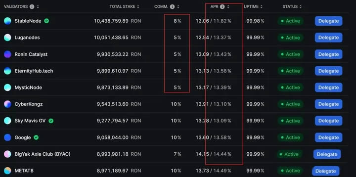 在22个验证节点中,选择APR(年化收益率)较高,COMM(佣金)较低的节点进行Delegate(委托)。一般来说,APR收益差别不大,佣金提取在5%-10%之间。