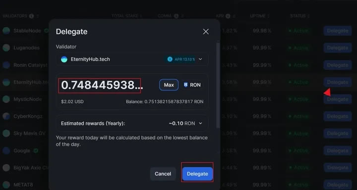 选择一个节点进行Delegate,输入你计划质押的数量。记住,wallet里至少保留0.1个RONIN作为gas费。