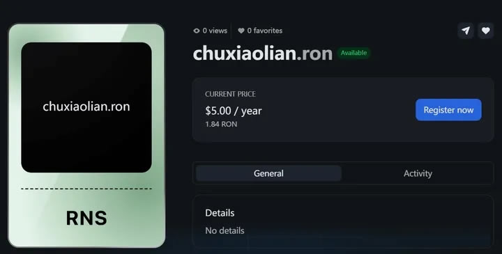 RONIN还有域名服务,叫做Ronin Name Service,费用是5刀一年。虽然不知道持有域名是否会获得更多空投,或者有其他福利,但为了以防万一,也可以去注册一个。