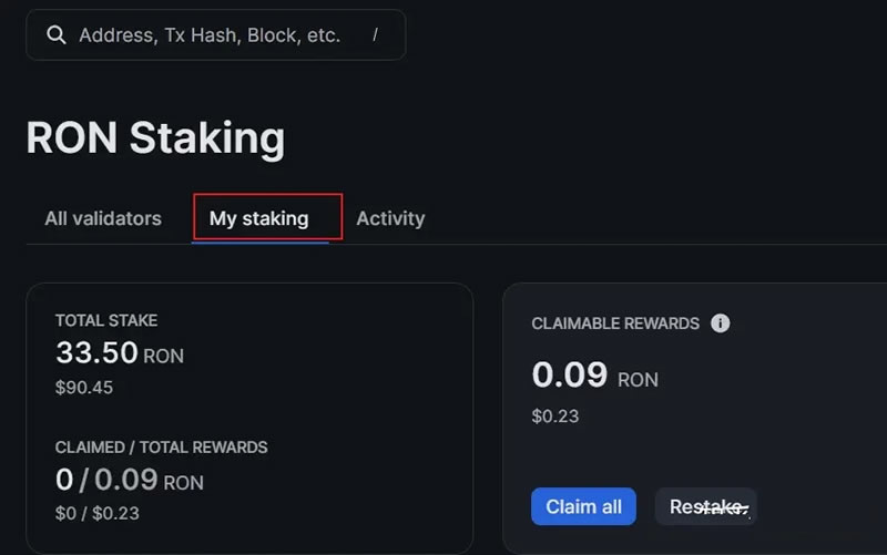 质押之后,在 "My Stakin" 可以看到累计质押的RONIN数量和APR收益。你可以随时领取再质押,也可以放着不管,但每次操作都要花费gas。如果数量不多,也可以攒一段时间再操作。
