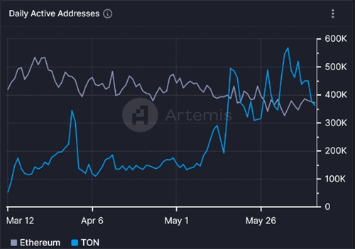 从数据来看,自 5 月中旬 TON 首次超越以太坊以来,双方的竞争就非常激烈。进入 6 月份后,TON 的活跃度更是稳步提升。在过去的十几天里,大部分时间里 TON 的每日活跃地址数都高于以太坊。尤其是在 6 月初,TON 创下了历史新高,是以太坊许久都未曾达到的水平。