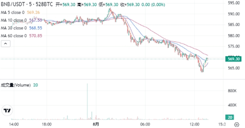 BNB当前的价格为$569.30。在过去24小时内,BNB价格下跌了2.72%,最高达到$593.10,最低为$563.00。