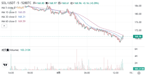 SOL当前的价格为$168.72。在过去24小时内,SOL价格下跌了6.64%,最高达到$184.56,最低为$165.89。