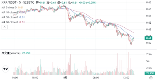 XRP当前的价格为$0.60700。在过去24小时内,XRP价格下跌了4.03%,最高达到$0.65730,最低为$0.59670。
