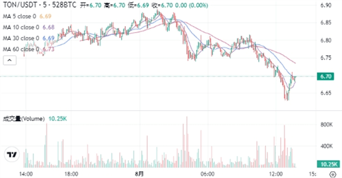 TON当前的价格为$6.70。在过去24小时内,TON价格下跌了0.71%,最高达到$6.89,最低为$6.63。