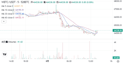 WBTC当前的价格为$64,338.00。在过去24小时内,WBTC价格下跌了2.93%,最高达到$67,698.90,最低为$63,683.90。