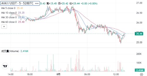 AVAX当前的价格为$25.43。在过去24小时内,AVAX价格下跌了3.87%,最高达到$26.89,最低为$24.93。