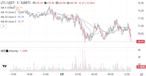 LTC当前的价格为$70.27。在过去24小时内,LTC价格下跌了2.28%,最高达到$72.40,最低为$69.27。