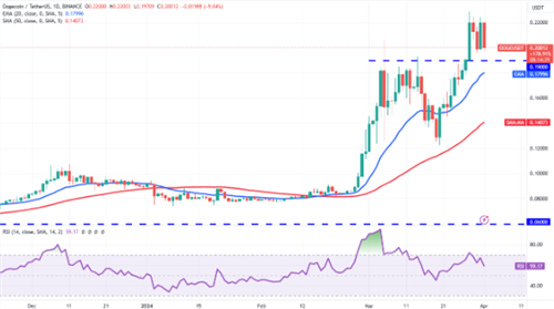 这种僵局给了空头机会。他们正密切关注市场动态,准备利用任何有利条件,将DOGE/USDT交易对的价格推低至20日指数移动平均线(EMA)下方,大约在0.18美元。如果他们成功了,市场情绪可能会受到影响,引发更多的卖盘,价格可能会进一步下跌,寻找下一个支撑点——50日简单移动平均线(SMA),目前在0.14美元左右。