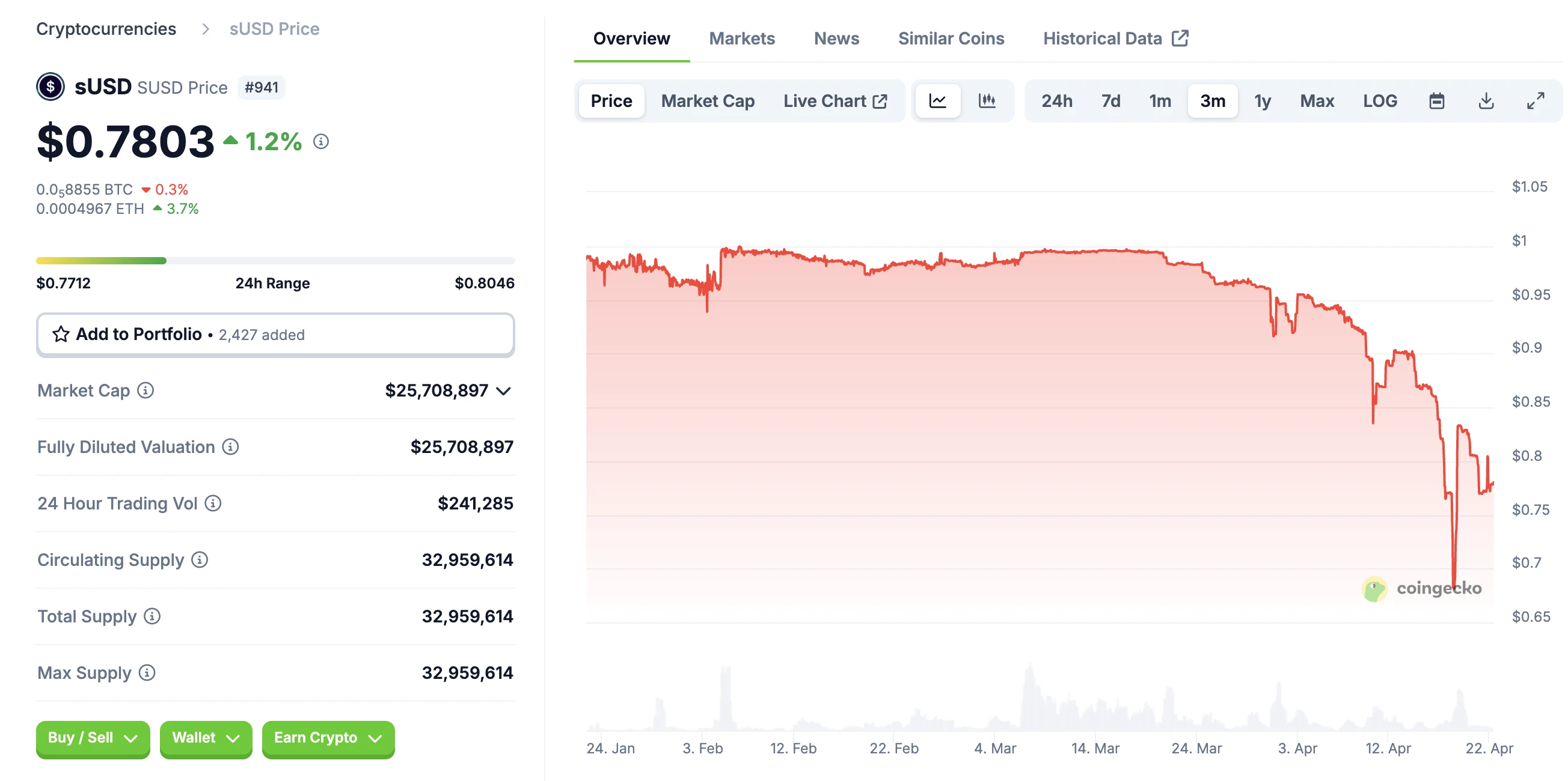 最近,Synthetix 的稳定币 sUSD 因长时间脱锚而引起了市场的广泛关注。从 3 月 20 日首次出现脱锚迹象以来,sUSD 的脱锚幅度不断扩大,曾一度跌破 0.7 美元,截至目前报价为 0.78 美元。虽然 Synthetix 推出了一系列修复措施,sUSD 在低位似乎有所企稳,但能否重新回归锚定价格仍是一个复杂的问题。