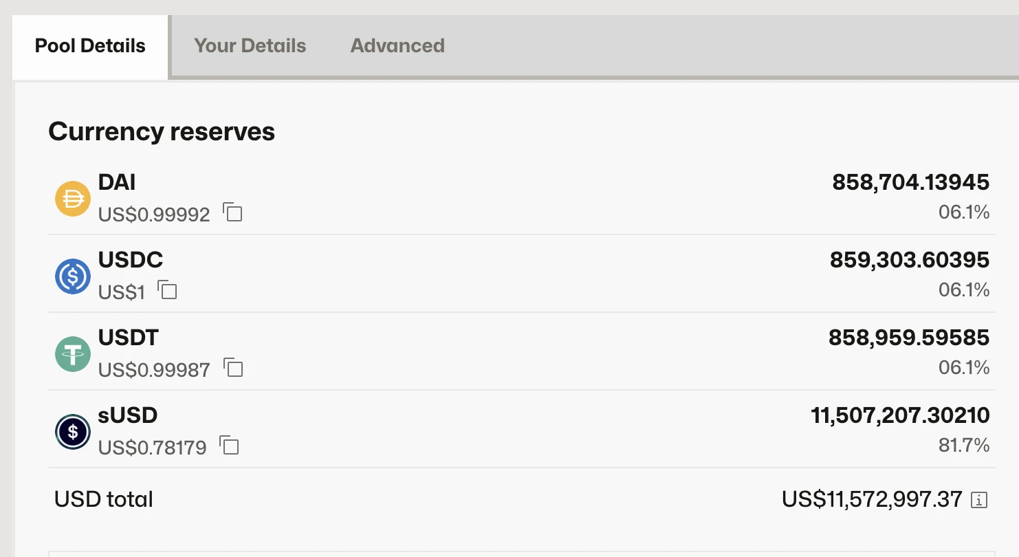 然而,随着个人债务的免除,当 sUSD 价格偏离锚定值时,SNX 质押者不再有动机以低价回购 sUSD 偿还债务,导致原有的自我锚定调节机制失效。这是 sUSD 脱锚的根本原因。脱锚情况加剧的原因在于 sUSD 的流动性不足。以 Curve 上最大的池子(sUSD/USDC/DAI/USDT)为例,总计约 1151 万美元的流动性中,sUSD 池内份额占比约 81.7%,这意味着实际的退出流动性在脱锚过程中被大量消耗。