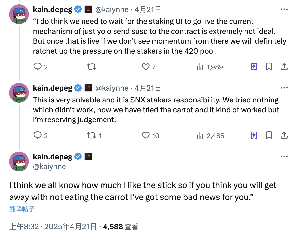 尤其是条件要求更严、激励力度更大的第三项措施,Kain 昨日曾发文提到对该项措施的期望,并强调问题完全可解,团队将通过优化激励机制逐步解决脱锚问题。值得一提的是,Kain 还提到如果 SNX 质押者不采用新推出的质押机制来帮助解决 sUSD 脱锚问题,将会对他们施以“大棒”,或暗示在多项激励措施后,接下来将通过惩罚条件来对仍不“配合”修复行动的用户进行施压。