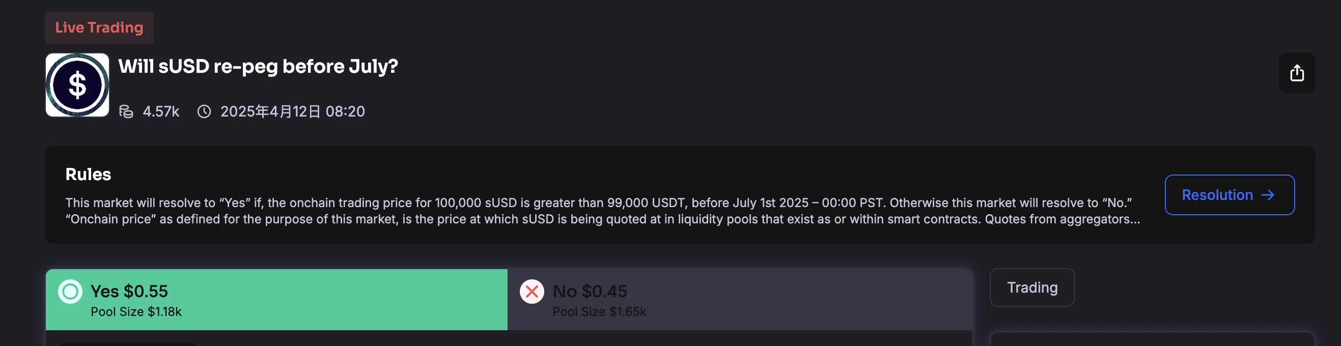 相较于押赌回锚,目前市场上似乎正在另一个套利机会 —— 预测市场。预测市场 Truemarket 已上线了关于 sUSD 能否在七月之前回锚的预测池,当前 Yes 份额的报价为 0.55 美元,No 份额的报价为 0.45 美元。
