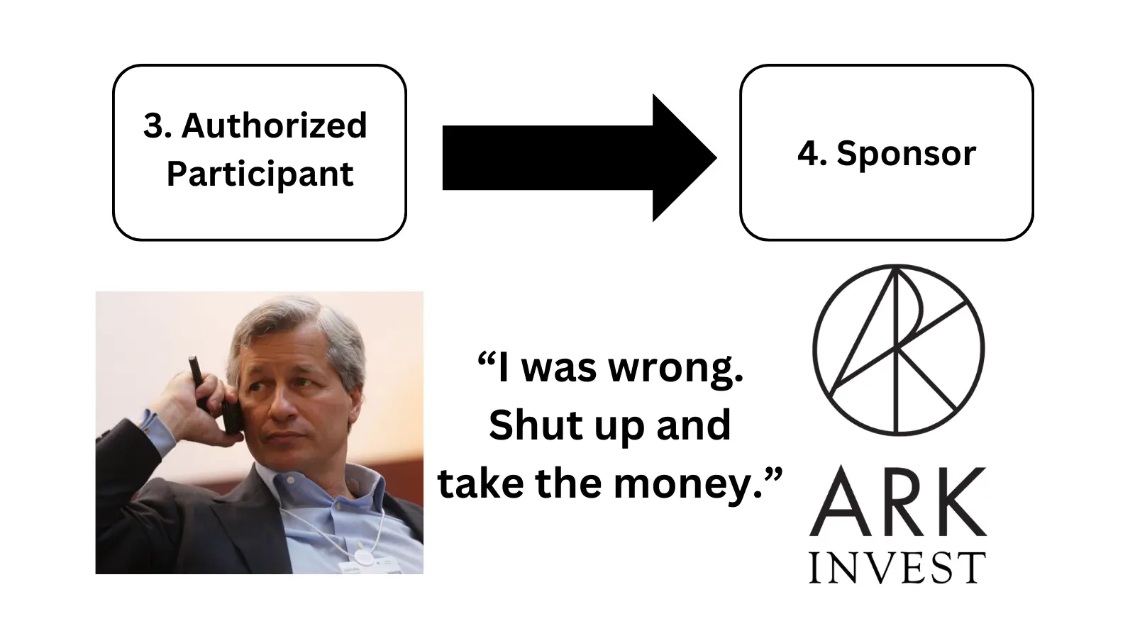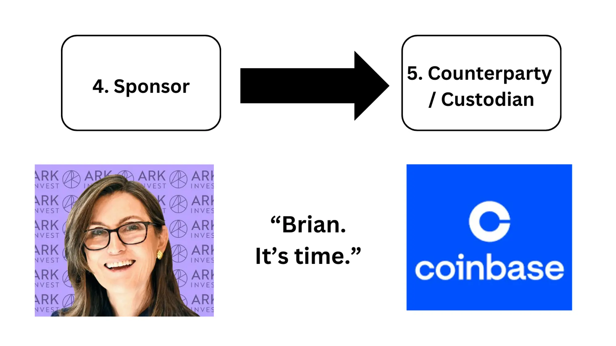 交易对手,如 Coinbase,负责处理 ETF 比特币的买卖。他们根据发起人的指示操作,确保 ETF 的比特币持有量与其股票数量保持一致。托管人(例如 Coinbase)负责 ETF 比特币资产的安全存储,确保信托持有的比特币资产的安全性和监管合规性。发起人根据 AP 的活动(创建或赎回 ETF 份额)指示比特币交易对手买入或卖出比特币。比如,在 Jamie Dimon 从 Cathie Wood 那里订购所有股票并尽可能多地创建股票后,Cathie 会打电话给 Coinbase 的 Brian Armstrong,说:“Jamie 的 FOMO 情绪正如我们所料。我需要立即买下你所有的 BTC。”这就是链上乐趣所在。