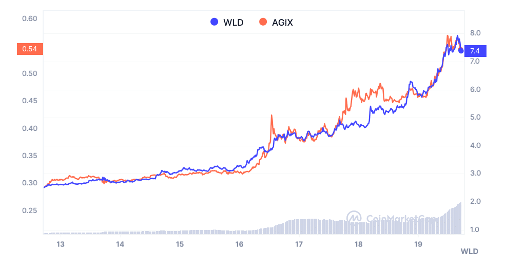 Worldcoin (WLD) 和 SingularityNET (AGIX) 市场表现图表