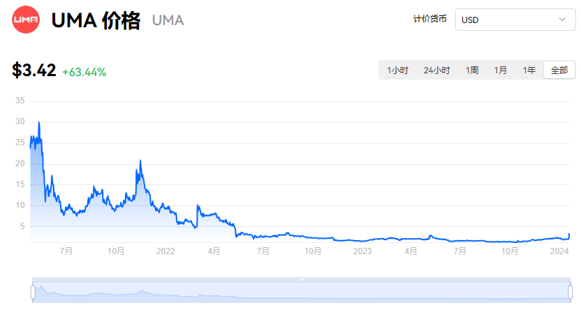 UMA 当前价格为 $3.42。UMA 的价格在过去 24 小时内上涨了 63.44%。目前,UMA 市值排名为第 190 名,实时市值为 $2.62亿,流通供应量为 7,599.39万 UMA,最大供应量为 1.18亿 UMA。我们会实时更新 UMA/USD 的价格。UMA 价格表现 (美元)