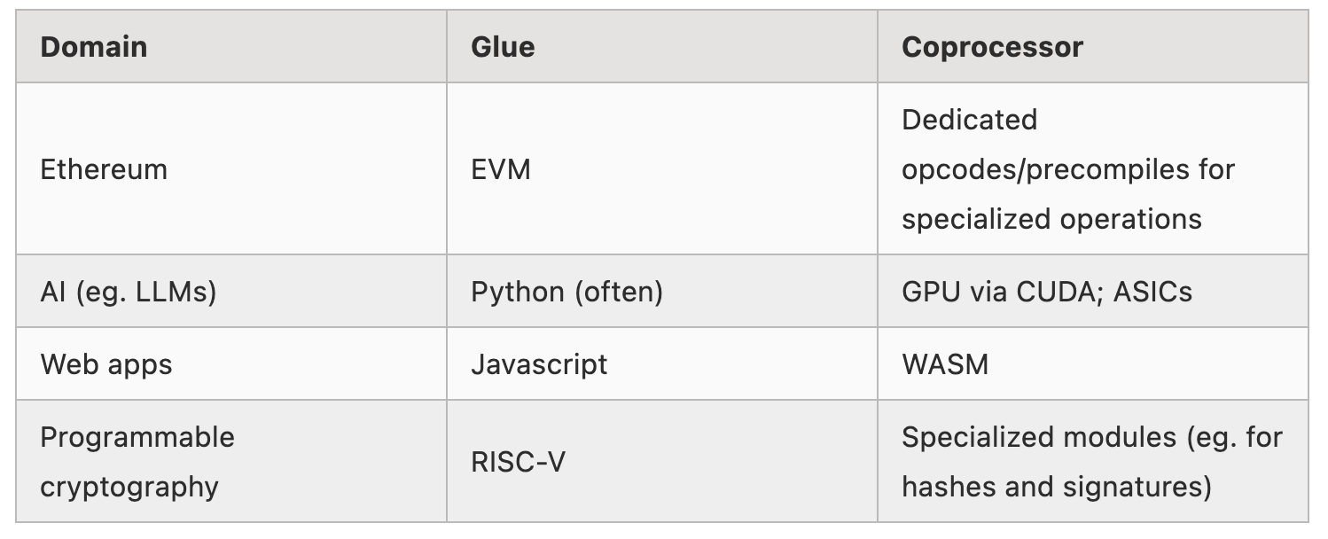 以太坊的共同创始人Vitalik Buterin最近写了一篇文章,探讨了如何通过“胶水(glue)和协处理器(coprocessor)”架构来提升现代运算的效率。这种架构将运算分成两部分:一部分是通用但效率较低的“业务逻辑”,另一部分是高度结构化且运算密集型的“昂贵工作”。通过灵活的通用“胶水”组件和高效的专用“协处理器”,可以优化这两种运算形式。