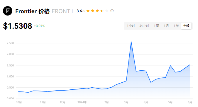 目前,Frontier的价格为$1.5308。在过去24小时内,Frontier的价格上涨了+3.08%。Frontier的市值排名目前为第183名,市值为$1.34亿。流通中的FRONT币总量为87,456,250,最大供应量为90,000,000 FRONT。我们会持续更新Frontier/USD的价格信息。