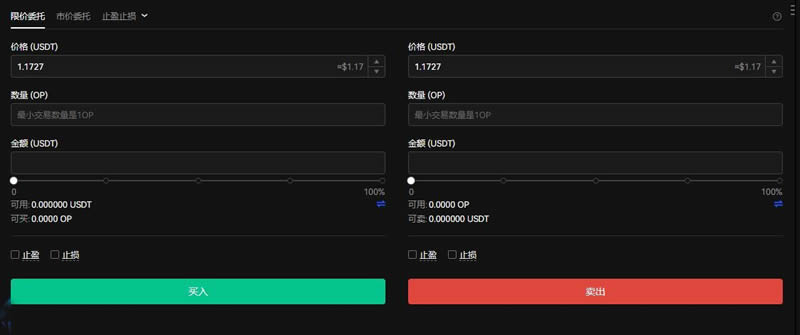 9.填写OP购买数量,点击买入,若是卖出,填写OP卖出量,点击卖出即可。(从交易的页面可以看到OP币的最小交易数量是1OP)