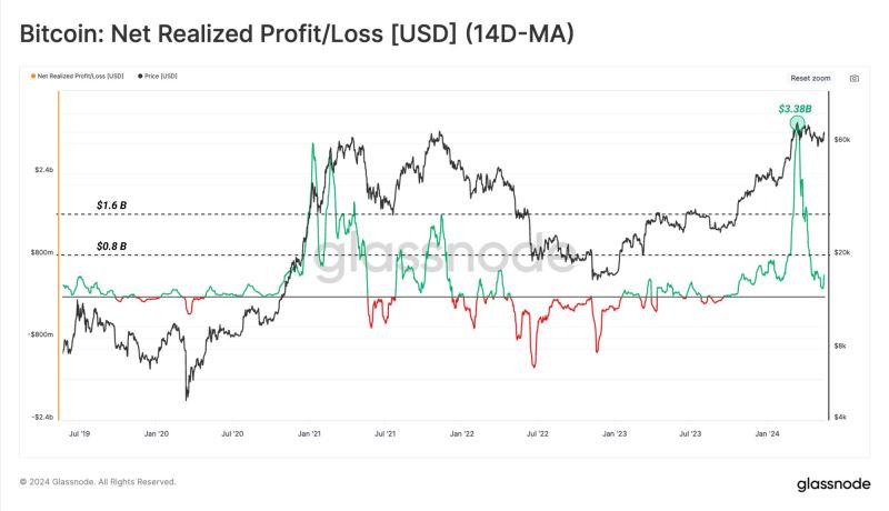 这张图显示的是比特币的净实现利润/亏损。简单来说,当投资者以盈利了结时,已实现上限会增加,因为总有新的购买意愿以更高的价格接手这些数字资产。反之,当出现亏损时,这个指标就会下降,因为之前高价买入的数字资产,现在以较低的价格出售了,导致整个市场投入的资金总额减少。