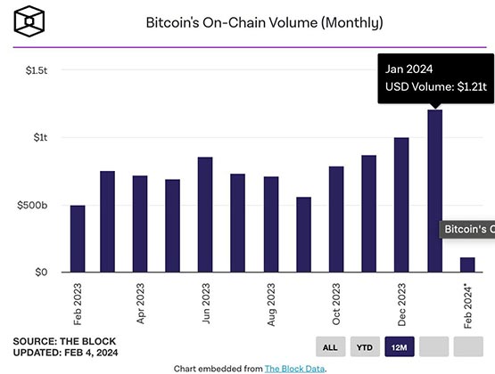 根据 The Block 的数据,比特币的链上交易量在最近一段时间内出现了显著的增长。今年一月份,比特币的链上交易量达到了 1.21 兆美元,是自 2022 年 9 月以来的最高记录。要知道,当时比特币的价格才 2 万美元左右。
