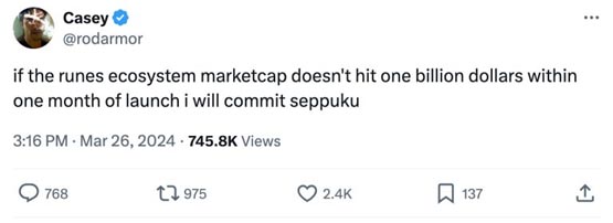 有趣的是,Runes协议的开发者Casey曾开玩笑说,如果符文协议上线一个月内市值未达到10亿美元,他会自杀。目前符文协议的最高市值约为9.986亿美元,虽然Casey的预测差一点点,但也相当精准。