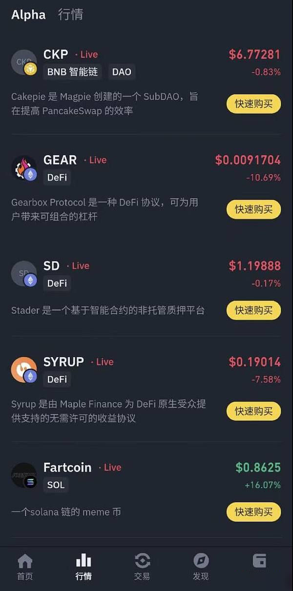 2024年末,Binance Alpha公布了两批项目名单,包括KOMA、Cheems、APX、ai16z、AIXBT、CKP、GEAR、SD、SYRUP和FARTCOIN。第一期以Meme代币为主,第二期则涵盖了多个DeFi项目。